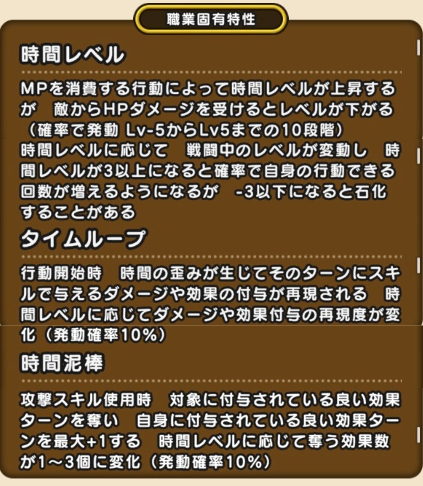こちらは時間レベルを上昇させると、さまざまな恩恵が得られ、レベルが下降するとデバフがかかるようなスキルになります!