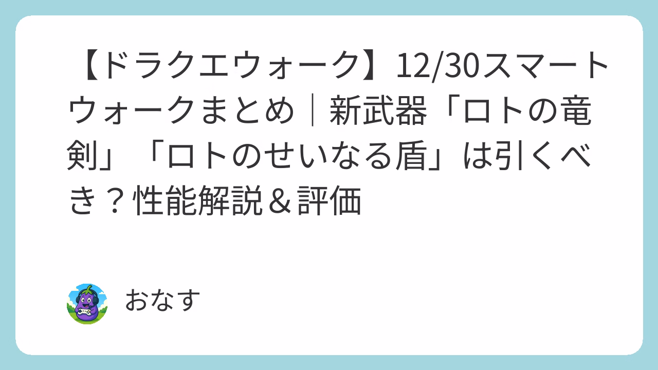 今回は12月30日のスマートウォーク内で発表されたイベントの更新内容等のまとめ、新武器「ロトの竜剣」「ロトのせいなる盾」の性能紹介&評価、引くべきかをこれまでの経験則から、ナス科ライトゲーマー目線で解説していきます!!