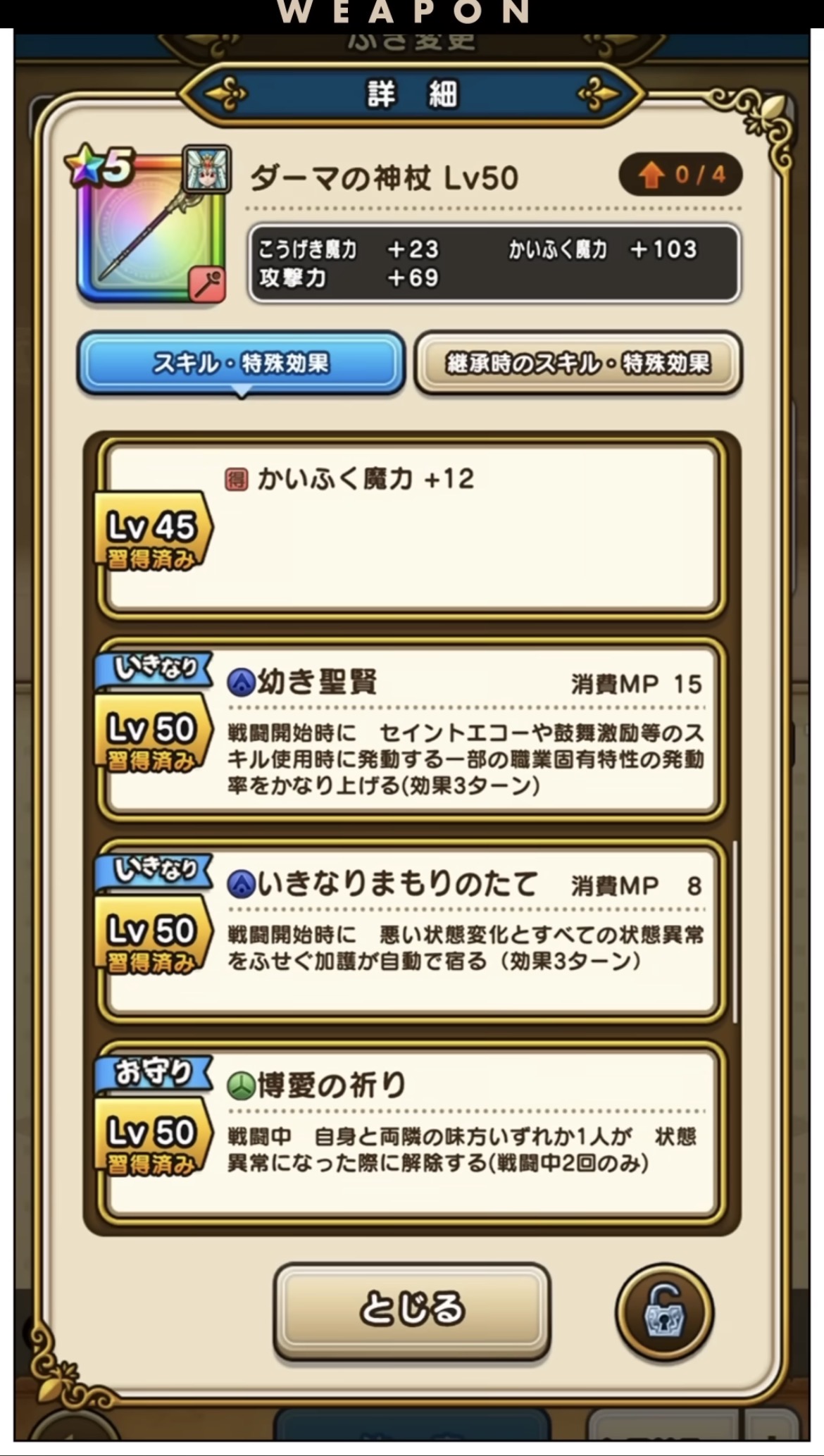 こちらは大神官であれば、セイントエコーや鼓舞激励の発動確率を上げ、ピンチの時や、バフの重ねがけをスムーズにしてくれるものとなっており、かなりありがたい優秀スキルです👍