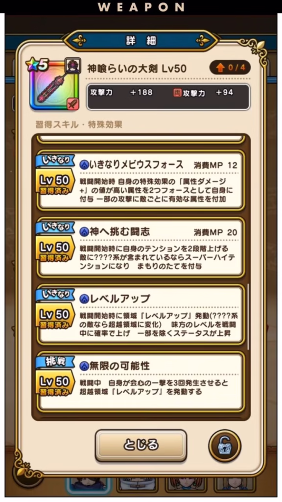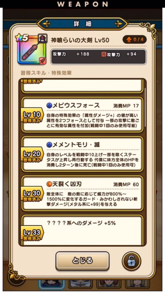 これはエルギオスが使ってきたメメントモリを味方に付与、味方のHPを消費して発動することができて、自身のレベルを10UP、さらに再行動ができるので、いわゆるロマン砲のような使い方ができます!