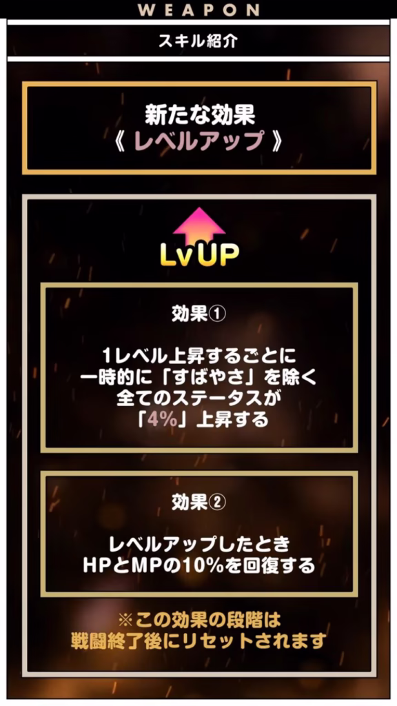 また、レベルアップ時にHPとMPが10%回復するので、長期戦においての補助効果、ターン経過するごとにステータスの上昇が狙えます。