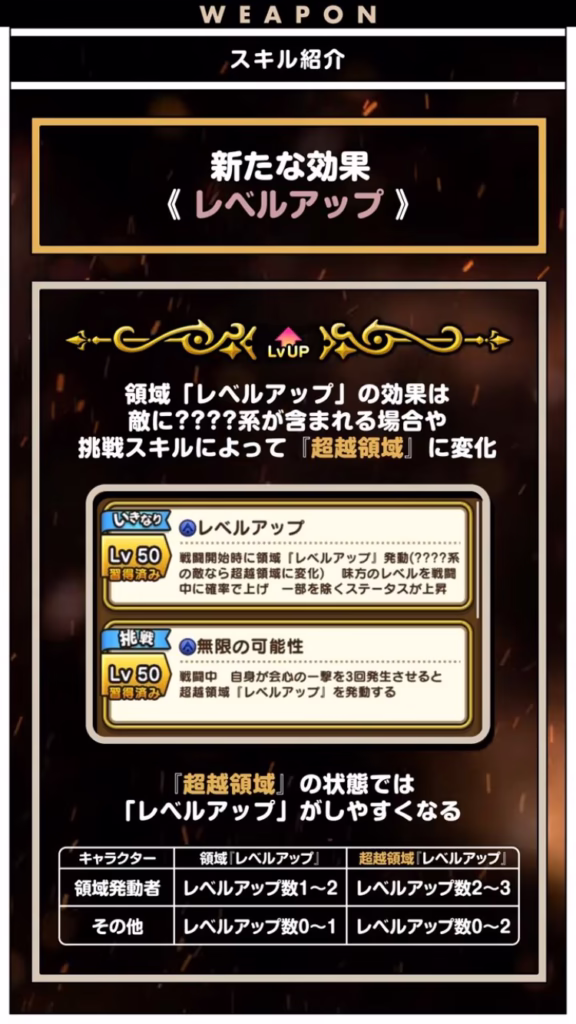 なお、領域時点では、レベルの上がり幅が、領域発動者は1〜2、その他は0〜1となりますが、挑戦スキル発動による超越領域下においては上がり幅が増え、領域発動者は2〜3、その他は0〜2と、超越領域発動により、ぐんぐん火力を伸ばしつつ、防御力等も上げることができます。