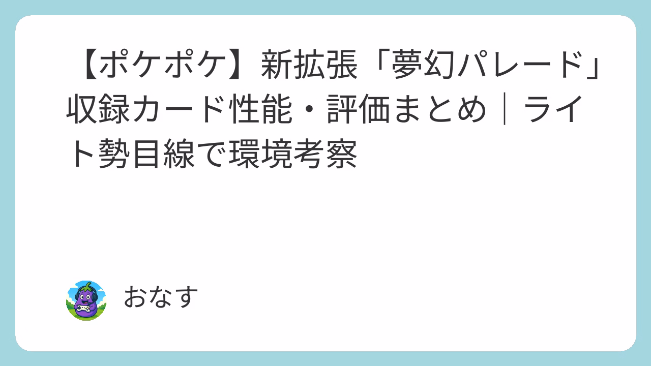 今回は1月22日に投稿された動画内での、ポケポケ新拡張パック「夢幻パレード」の収録カード性能紹介、評価、ナス科ライトゲーマー目線の気になるカードや新環境の考察など、自身の経験からまとめていきます🍆