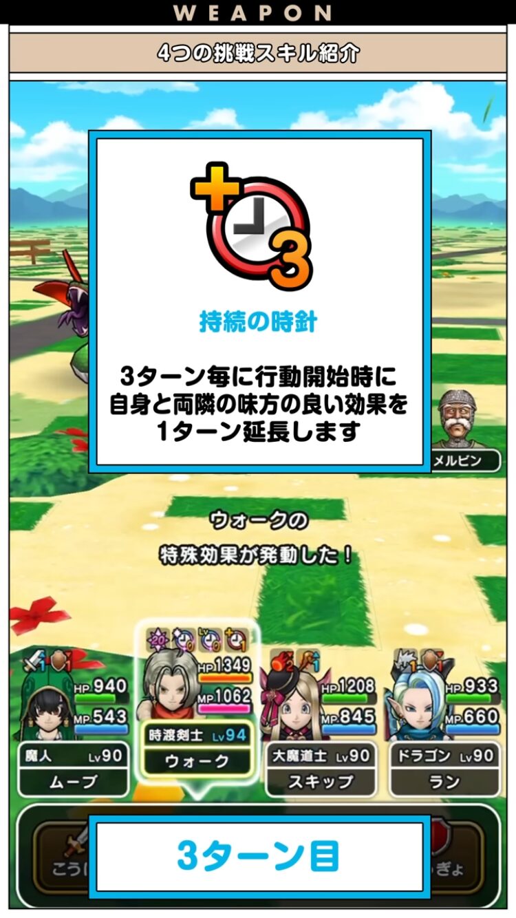 3ターンに1回行動開始時にMPを消費して、自身と両隣の味方の良い効果ターンを1ターン延長