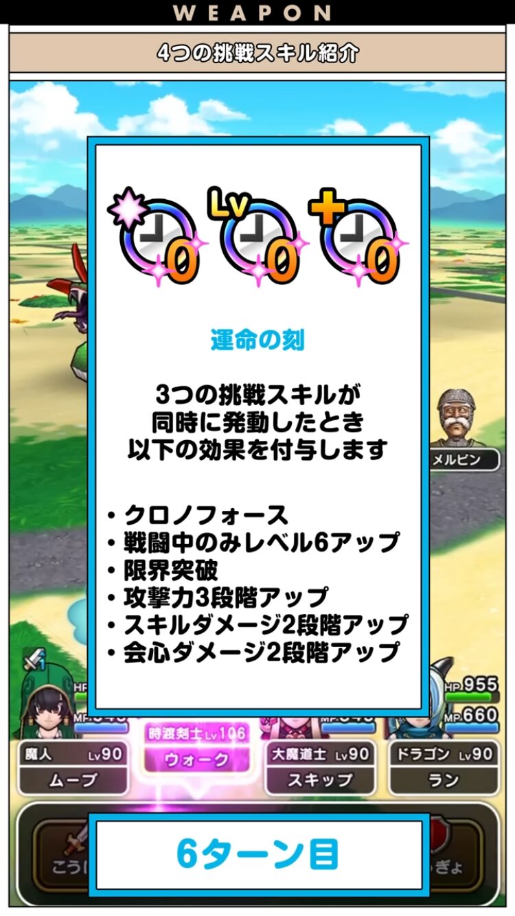 秒針、分針、時針が同時に発動したターン(最速6行動目)に、戦闘中レベル6UP、クロノフォース付与、限界突破付与、攻撃力、スキルダメ、会心ダメ強化